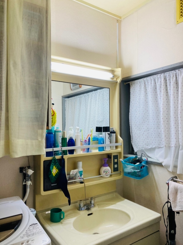 洗面鏡周辺の収納が少なく、蛇口も固定式のため、