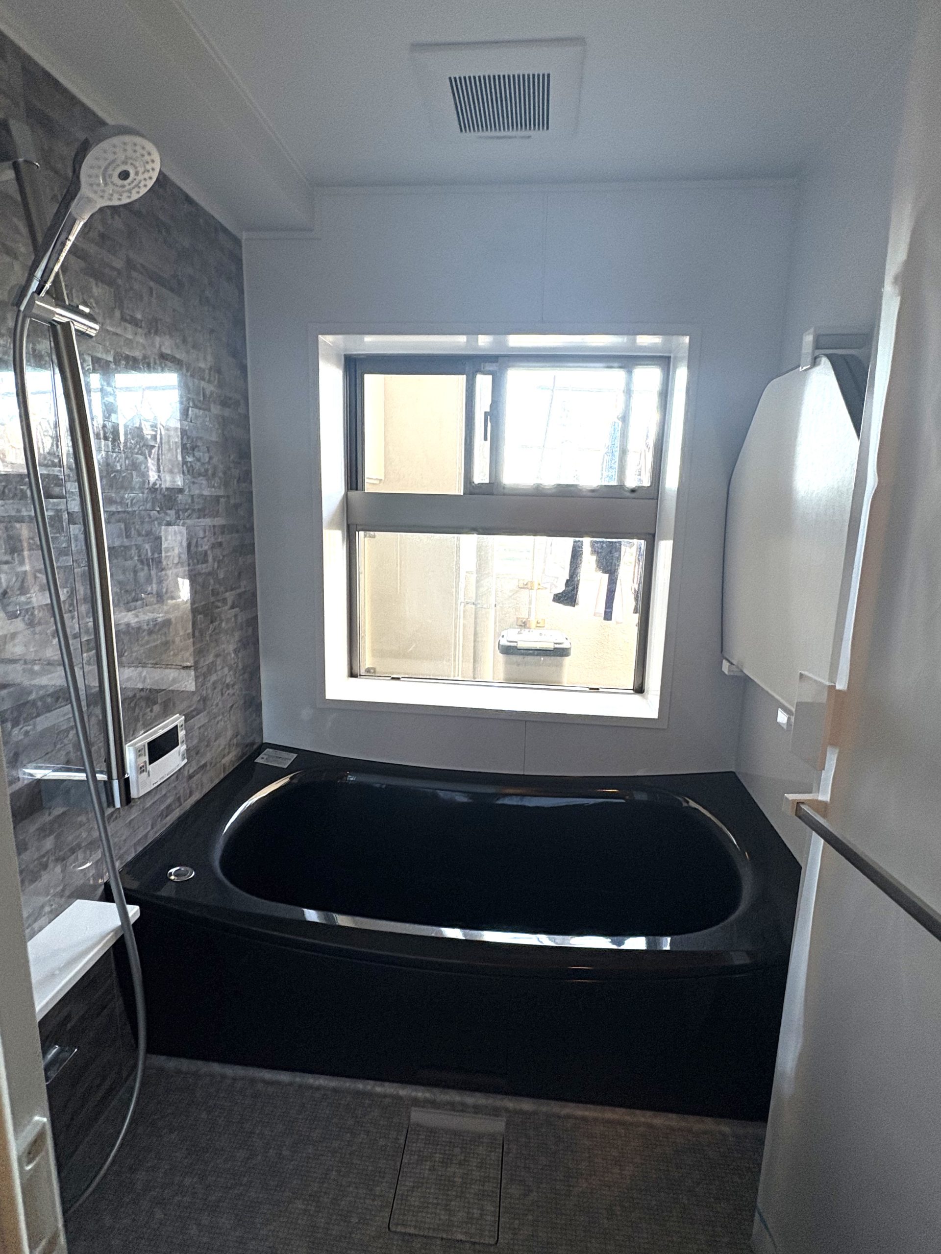 新しい浴室には、アクセントパネルに洗練された「石目グレー」を、浴槽には高級感あふれる「黒」を採用。